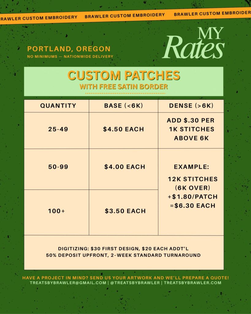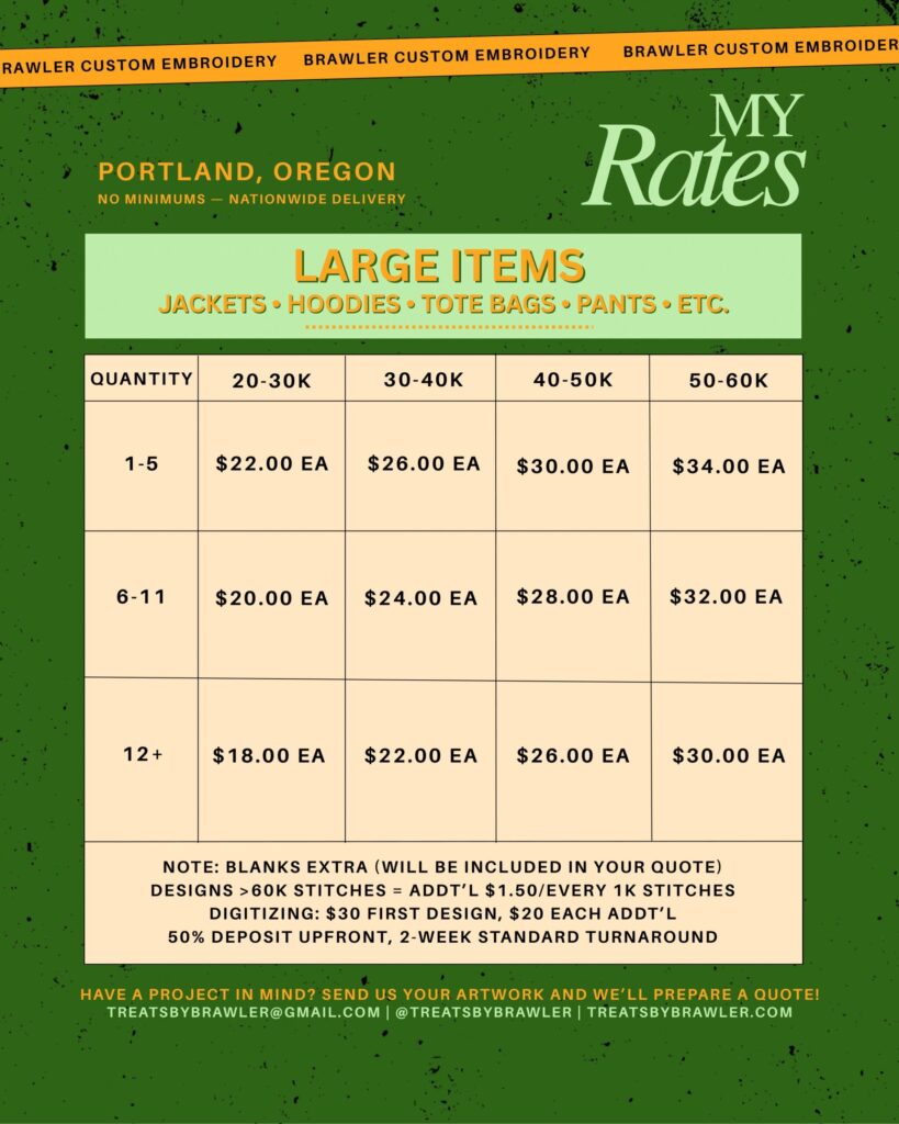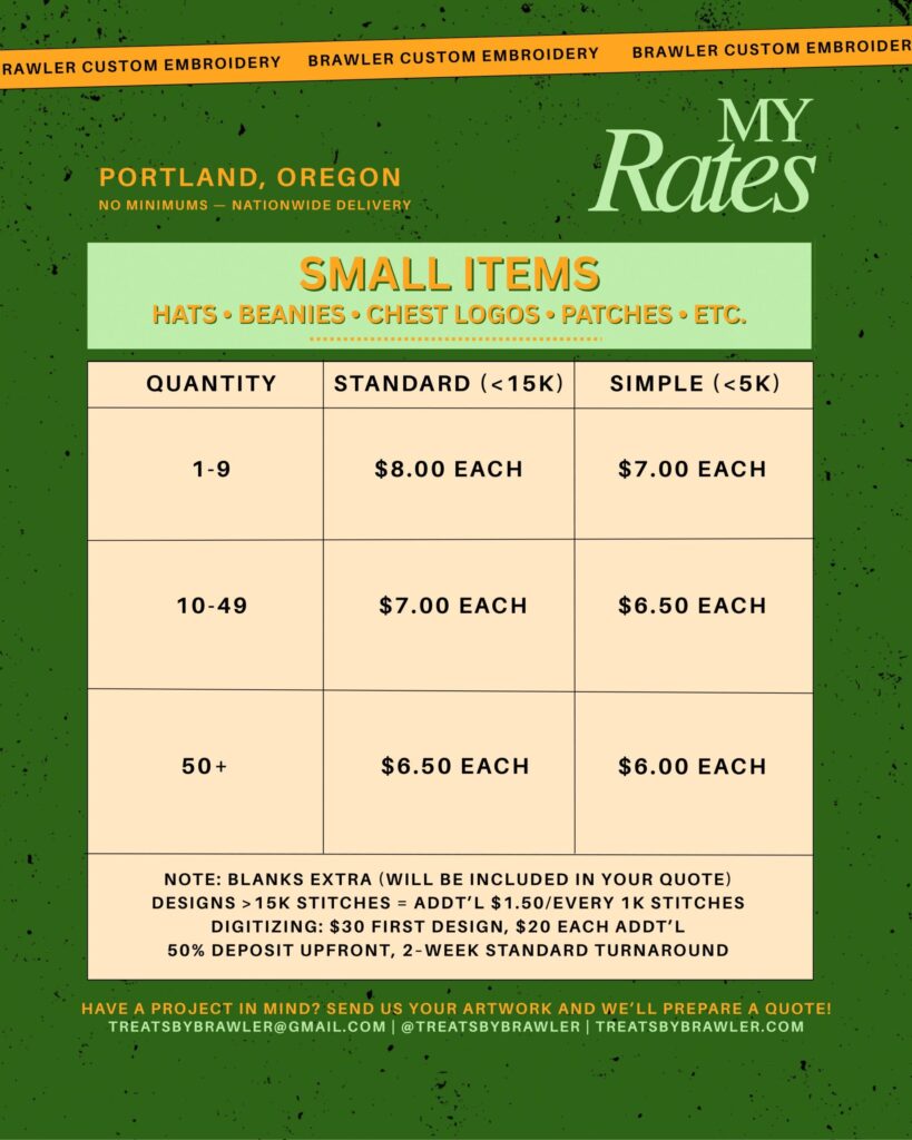 Explore our rate cards below to help you decide on the right quantity, items, and design for your PDX custom embroidery.